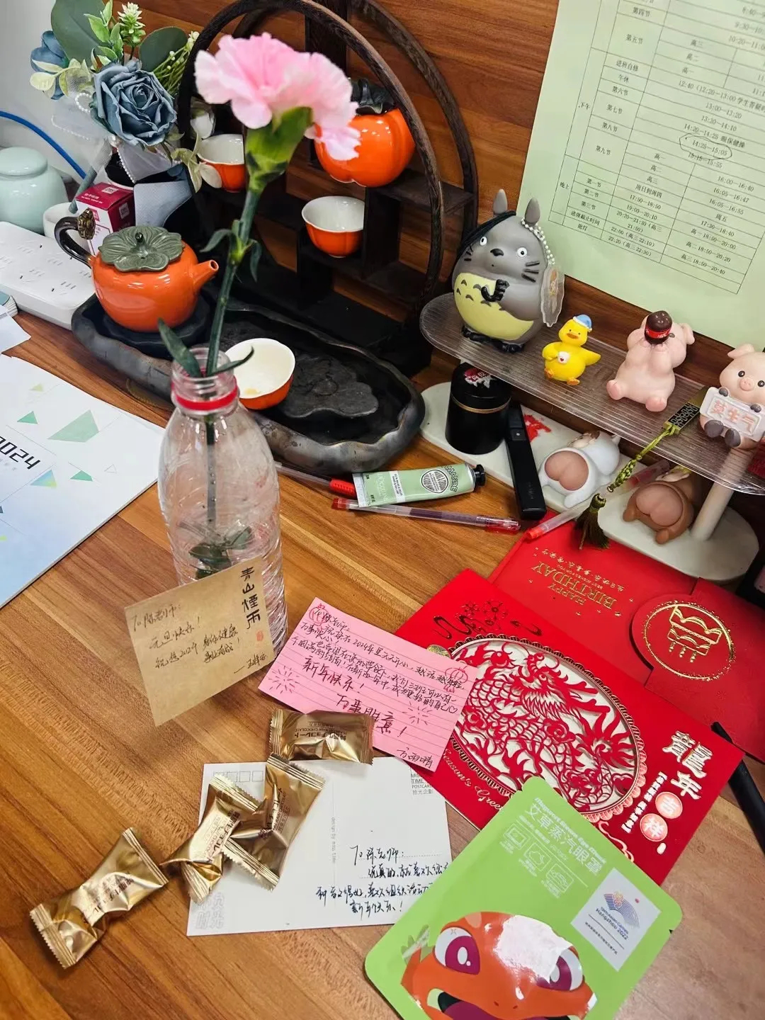 “他们说我的桌子一片狼藉,经常会有同学来整理书桌,说是学习紧张来调剂一下。”有些小节日,陈老师还会收到特别的惊喜。有同学用矿泉水瓶剪出一个花瓶的造型,上面插上一朵野花,也是孩子真心实意的爱。