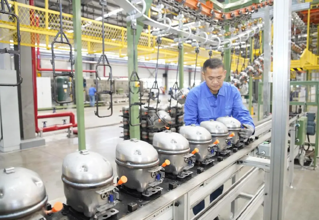 “项目新建了电泳涂装、壳体自动冲压、桁架机械手加工等多条自动化生产线,实现了从部件加工到整机组装检测一体化链条式生产。”黄石东贝压缩机有限公司技术总工戴竟雄说。