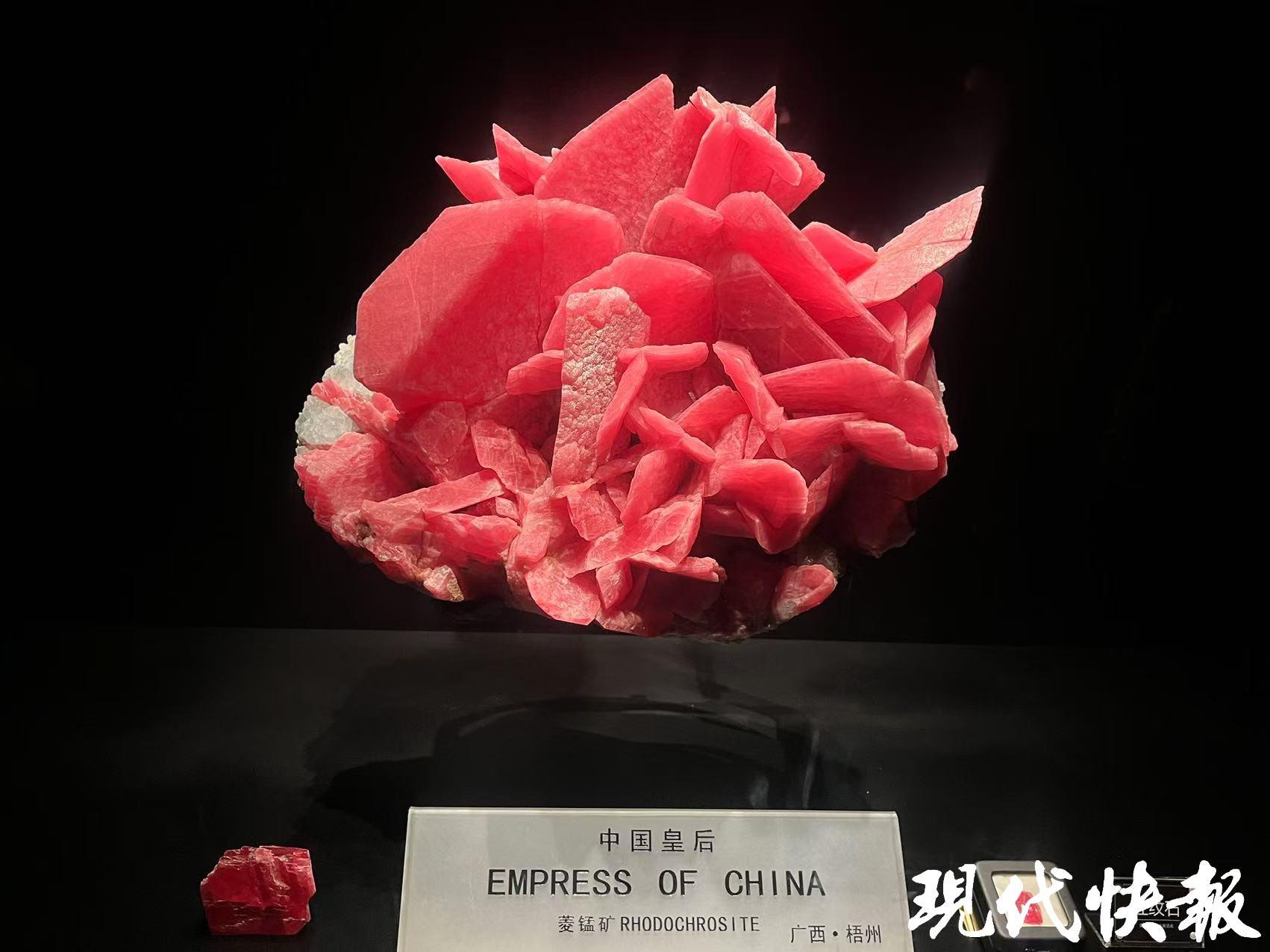 在一个单独的展柜中,陈列着一件颜色鲜艳、造型如同玫瑰的矿石。它就是这里的“镇馆之宝”——被誉为“中国皇后”的菱锰矿。工作人员介绍,这件矿石是于2009年在广西苍梧县梧桐矿被发现的,是中国发现的菱锰矿中单晶最大、质量最好的菱锰矿,轰动了2011年美国图森矿展。