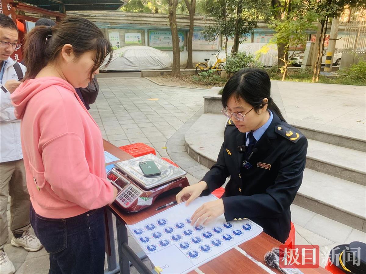 活动现场,极目新闻记者看到,市民徐女士将自己的手机放置在一台经武汉市计量测试检定(研究)所检定合格的电子秤上称“体重”,整机重量为230克。来自江岸区市场监管局球场市场监管所的工作人员随即在市民手机贴上一枚“体重”标签,这张标签由市场监管部门统一印制,会写上手机克数。