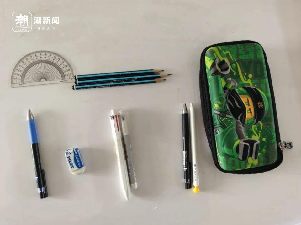 黑色水笔7支、红蓝水笔7支、普通铅笔6支、自动铅笔9支、荧光笔和记号笔一大把,再加上套尺、笔芯、橡皮、圆规、一块手表,摊开来铺了满满一桌。