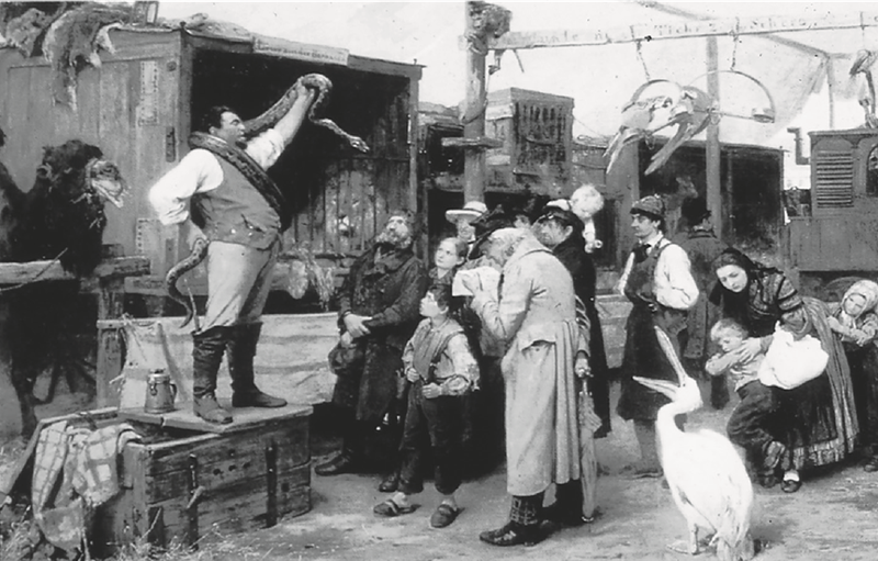 对于历史学家来说,指出不同历史时期之间的普遍差异通常并无多大意义,已是老生常谈的话题。但是,如果说从动物展览到动物园再到动物保护中心的发展过程没有太大意义的话,那么我们该如何理解几个世纪以来动物展示方式的变化呢?要回答这个问题,我们先来看看保罗·迈尔海姆1864年创作的《动物展览》这幅画,它描绘了流动式动物展览历史上不起眼的一幕。