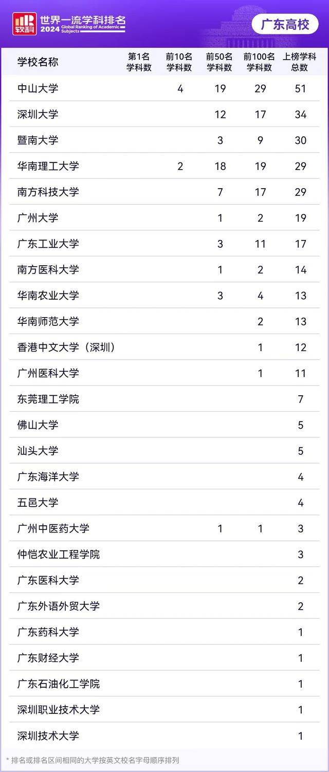高等教育评价专业机构软科11月11日发布了2024“软科世界一流学科排名”。2024年排名覆盖55个学科,涉及理学、工学、生命科学、医学和社会科学五大领域。记者从软科获悉,中国内地共有335所高校上榜,广东高校表现优异,共有26所高校的312个学科榜上有名。深大、南科大、港中大(深圳)、深职大、深技大均位列该榜。