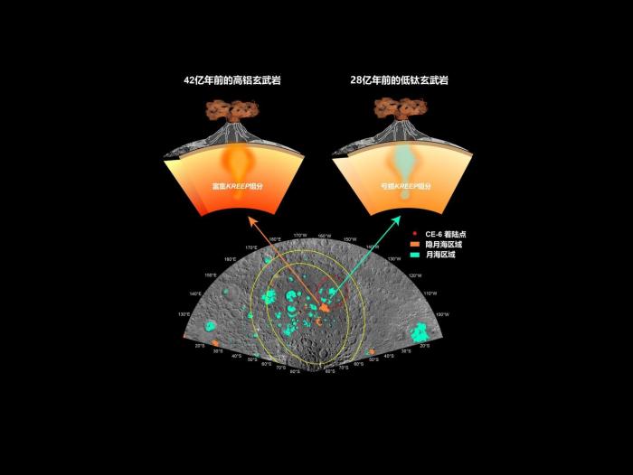 在发表于《自然》的研究中,中国科学院院士、中国科学院地质与地球物理研究所研究员李献华和研究员李秋立,与来自中国科学院国家天文台的研究团队根据5克月壤中分选出大于300微米的108颗玄武岩岩屑定年研究的结果,揭示嫦娥六号着陆点28(28.07±0.03)亿年前存在火山活动,且岩浆来自亏损克里普物质(富集钾、稀土和磷等元素的物质)的源区,其中一颗高铝玄武岩岩屑揭示42亿年前存在来自富集克里普物质源区的火山活动。
