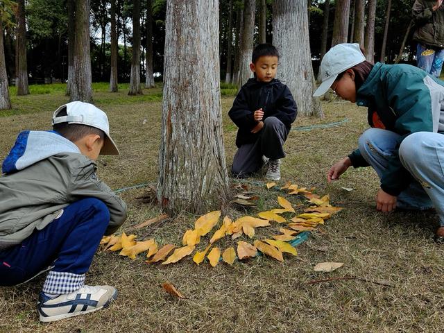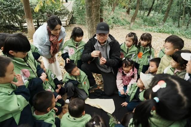 大自然里的一切都充满灵性。活动现场,肖雁宁取自然名“桃花”,小朋友们则取名各种动植物,在进行简单的互动游戏之后,肖雁宁与小朋友们共同踏上“自然盲径”,从大草坪漫步至树林“捡秋”,通过捡拾不同形状、大小、颜色的落叶和果实等,来亲近自然,感受生物多样性之美。随后,小朋友们以捡拾来的落叶为“笔”,在大地上挥洒创意,用一幅“大地艺术”诠释自然之美。