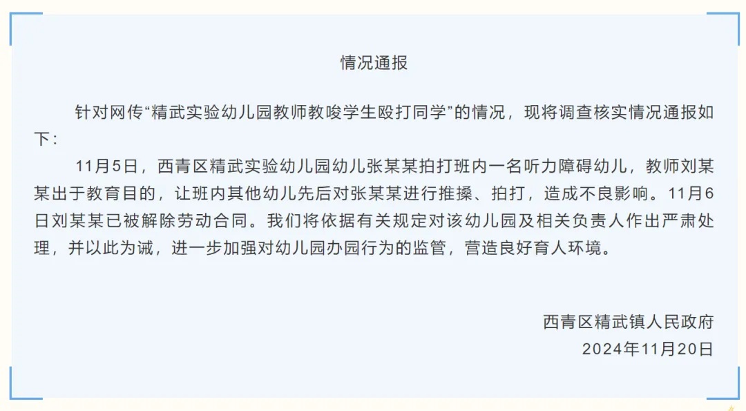 针对网传“精武实验幼儿园教师教唆学生殴打同学”的情况,现将调查核实情况通报如下: