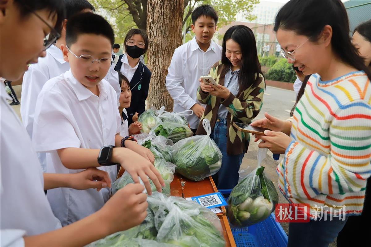 老师们化身“老主顾”,一边挑菜一边笑得合不拢嘴,也对这些辛勤耕耘的“小菜农”竖起了大拇指。“我还纳闷,前一阵子好几个学生问我土壤酸碱度的知识点,原来是为了种菜啊。今天看到他们收割的蔬菜,我也很兴奋,一口气买了三包白菜薹。”化学老师谌飞说。