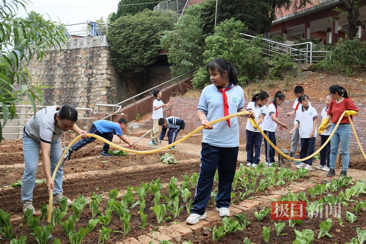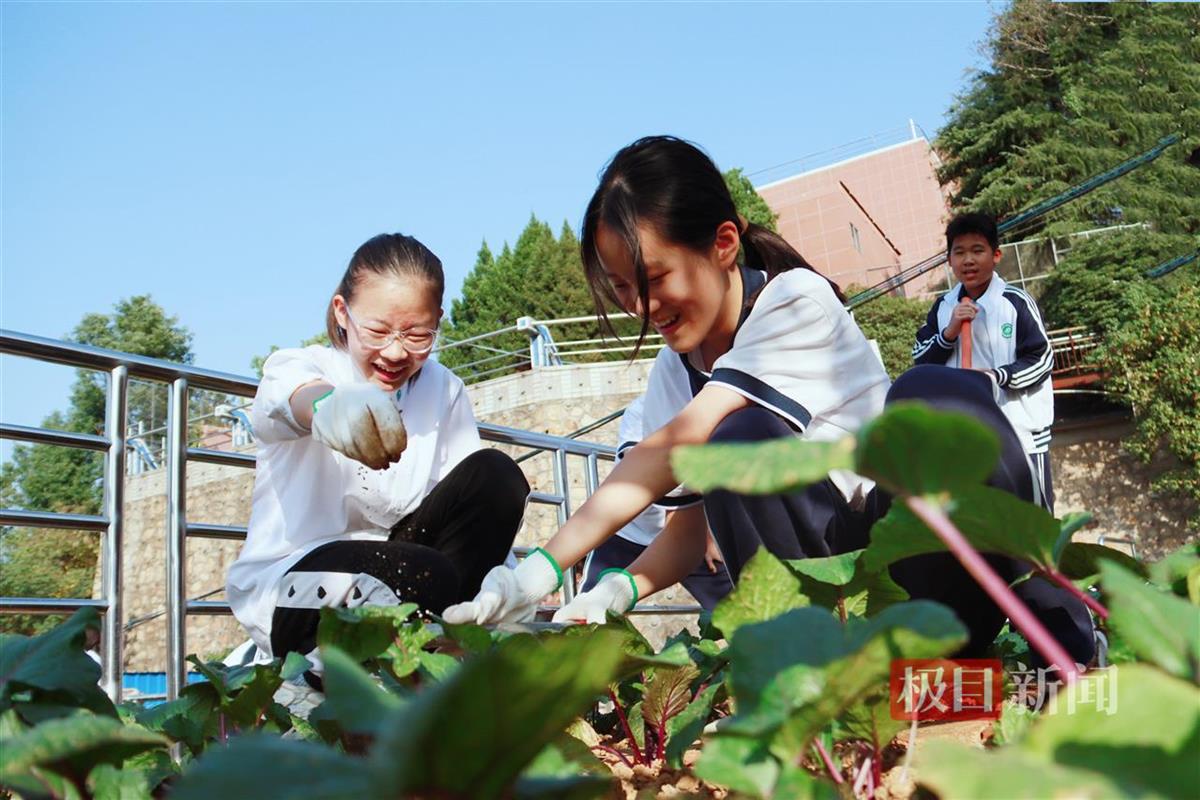 原来,学校“自砺农场”劳动实践基地于9月初正式启用,全校九个年级的学生都在基地包保了绿色蔬菜种植“责任田”,从此劳动教育有了场景化教学环境,孩子们亲身参与播种、浇水、除草等农作全过程。各学科教学也开辟了新阵地。数学老师带小学生测算菜苗生长每天速度;生物老师指导初一学生制作生物有机肥;劳技老师手把手教同学们锄地、翻土、浇水;美食选修课上,同学们亲手把劳动果实烹制为美味佳肴,品尝甜蜜收获……