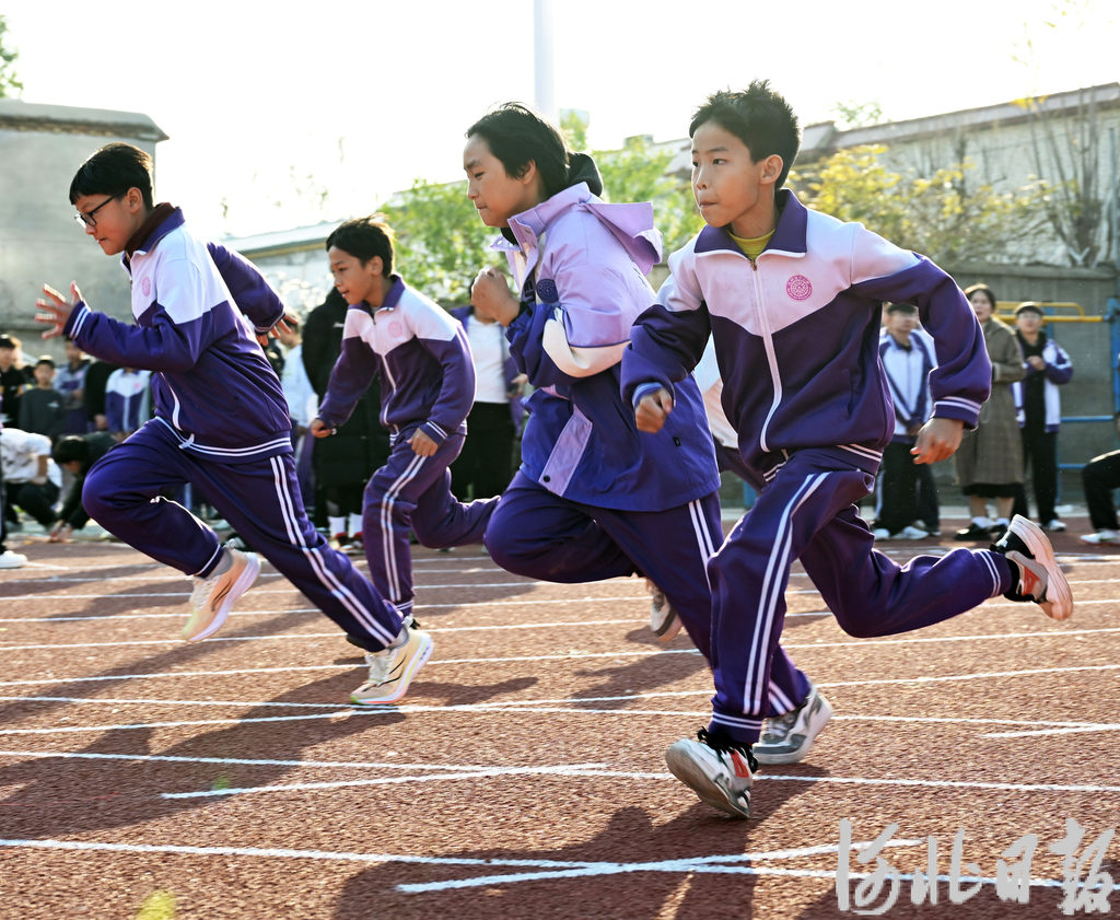 11月20日,宁晋县北新教育集团的小选手在百米跑比赛中奋勇争先。