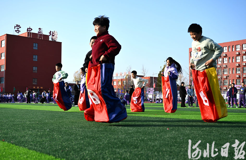 11月20日,宁晋县北新教育集团学生在参加袋鼠跳比赛。