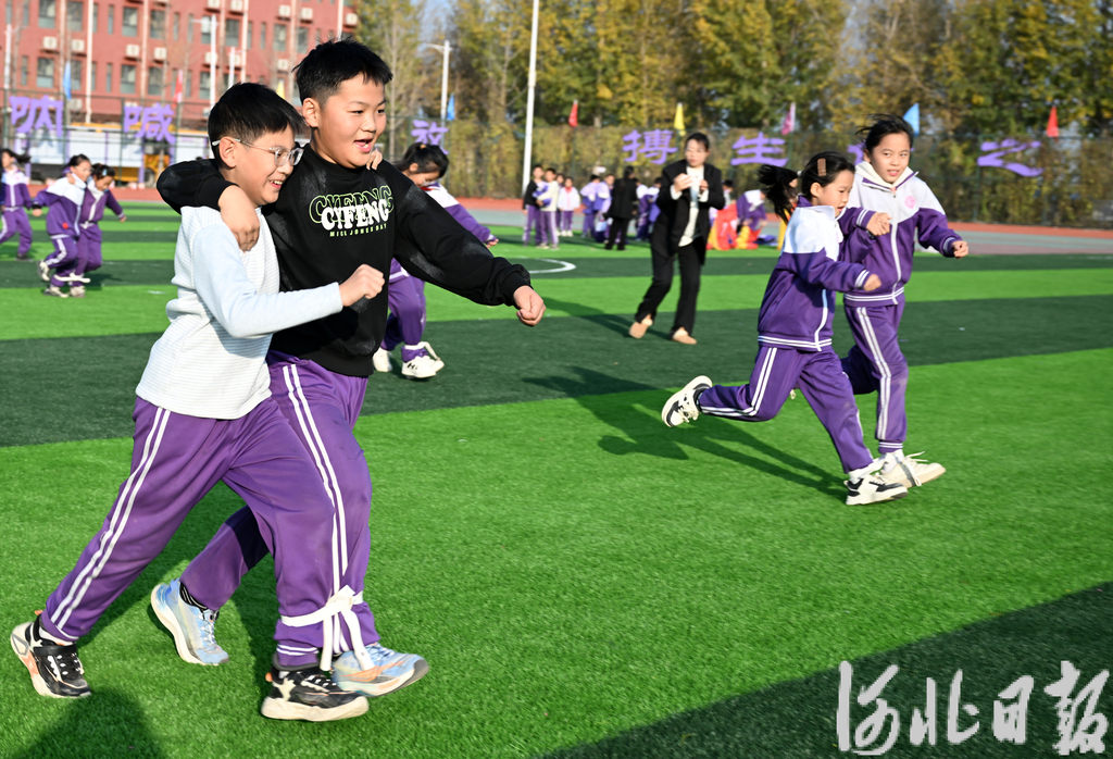 11月20日,宁晋县北新教育集团学生在参加两人三足比赛。