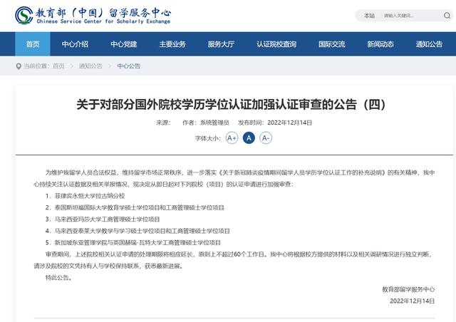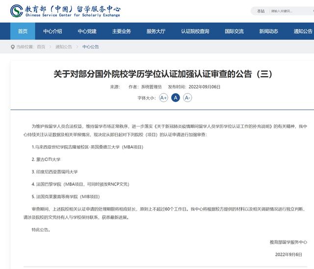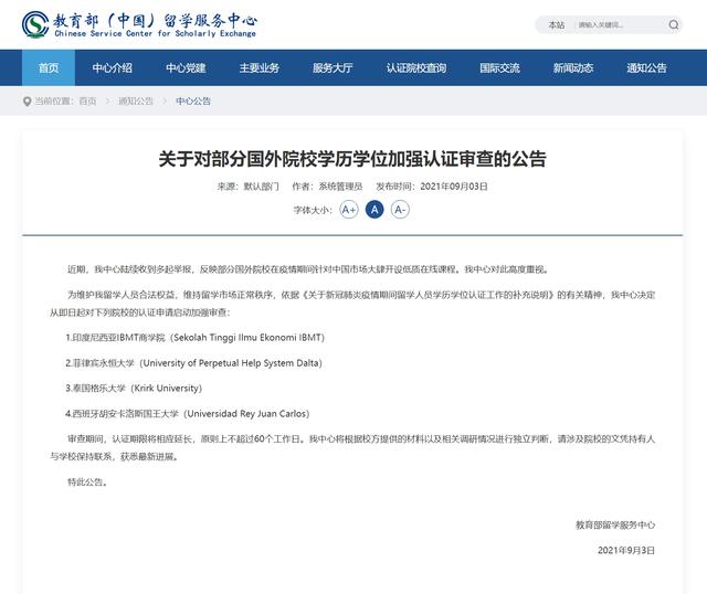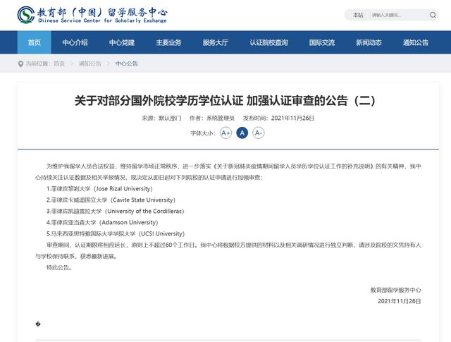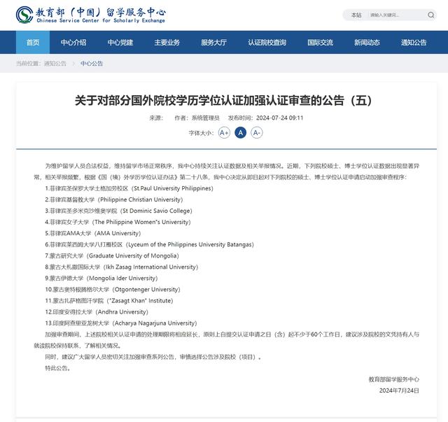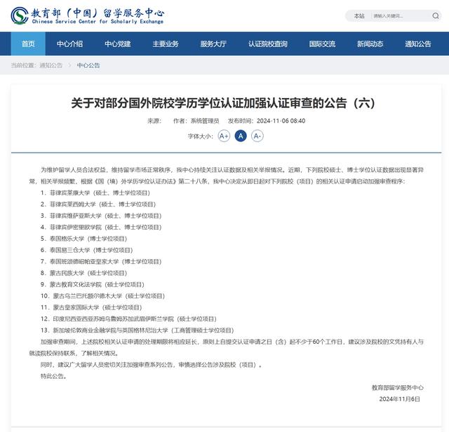 奔流新闻记者了解到,从2021年9月以来,教育部留学服务中心已陆续发布六个批次国外院校学历学位认证加强认证审查公告,涉及40多所高校,其中,菲律宾、泰国、印度、蒙古等国家的高校被重点加强审查。