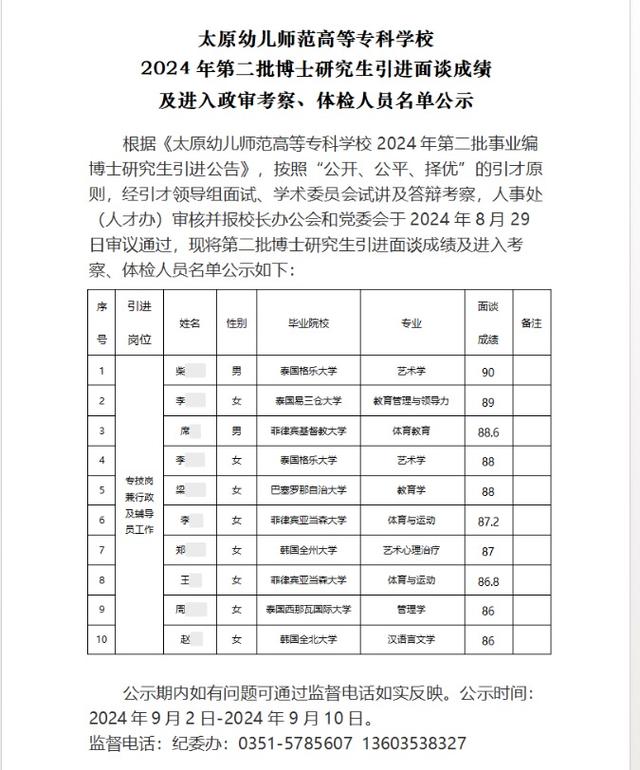 奔流新闻记者查询发现,今年9月2日,太原幼儿师范高等专科学校在其官网发布《太原幼儿师范高等专科学校2024年第二批博士研究生引进面谈成绩及进入政审考察、体检人员名单公示》,拟引进的10名博士有多人来自教育部留学服务中心加强认证审查公告中的院校。