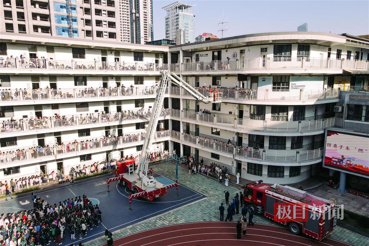 疏散演练结束后,消防战士们驾驶三辆消防车进入校园,进行了一场实战演练。消防云梯如同巨龙腾空而起,升降平台精准降落到东三楼,成功救下被困人员,赢得了全场师生的惊叹。学校师生代表、生活老师、安保人员积极参与,化身消防员,体验了消防服、灭火器、喷水枪的使用,直面“火灾”现场。