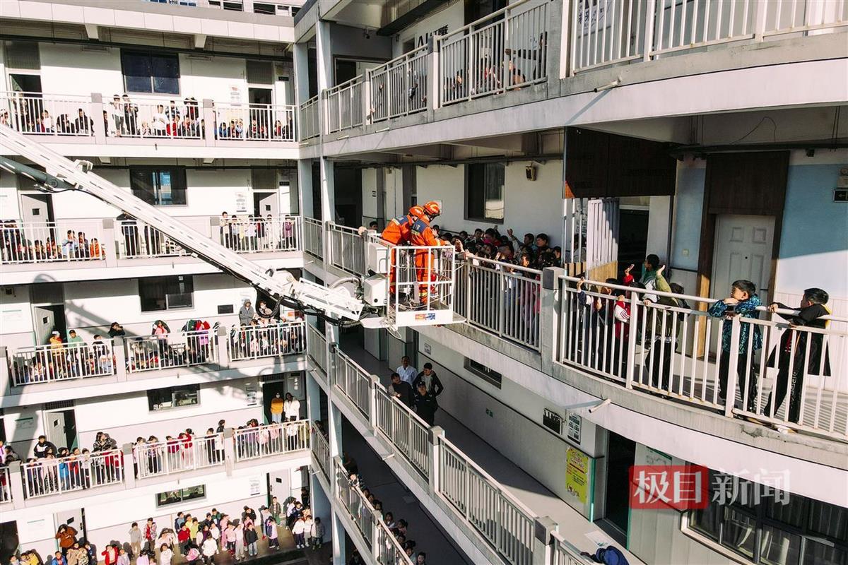下午2点15分,随着浓烟升起和第一次警报的拉响,70个班的3000余名师生迅速行动。在楼层疏散人员的指引下,师生们按照原定的疏散路线,用湿毛巾捂住口鼻、低姿贴墙通过楼道,安全、迅速、有序地撤离到大操场指定位置。