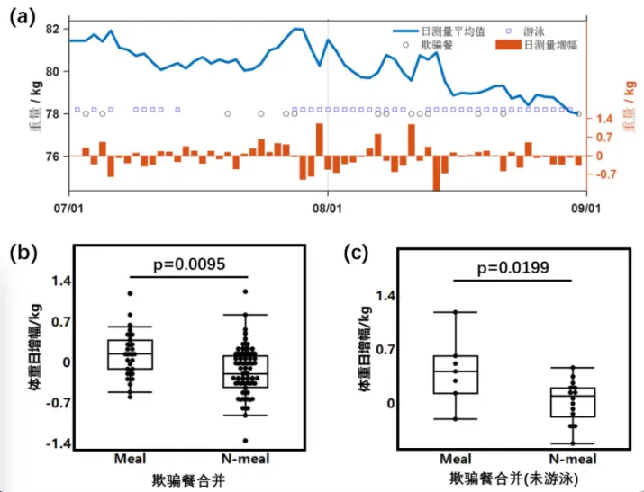 王春承论文中游泳减肥月的日均体重变化与欺骗餐及游泳数据。摘自受访者文章