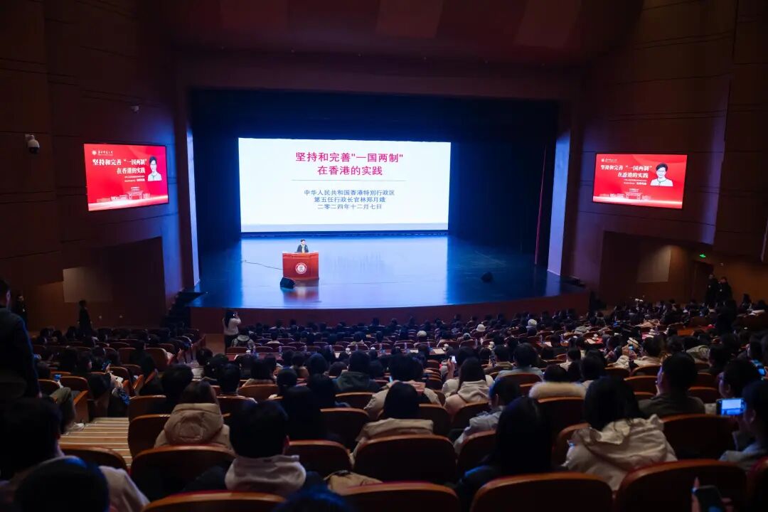 在大学生活动中心大礼堂,林郑月娥女士作了题为《坚持和完善“一国两制”在香港的实践》的主题演讲,并与现场师生交流。