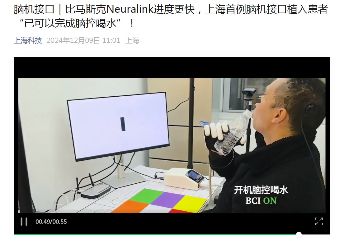 据上海科技微信公众号12月9日消息,上海首例脑机接口植入患者“已可以完成脑控喝水”。