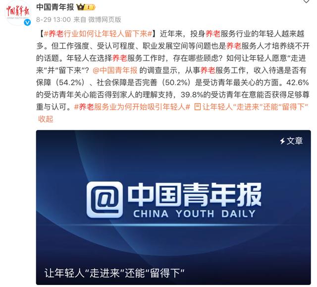此前,中国青年报一项调查显示,从事养老服务工作,收入待遇是否有保障是受访青年最关心的方面。