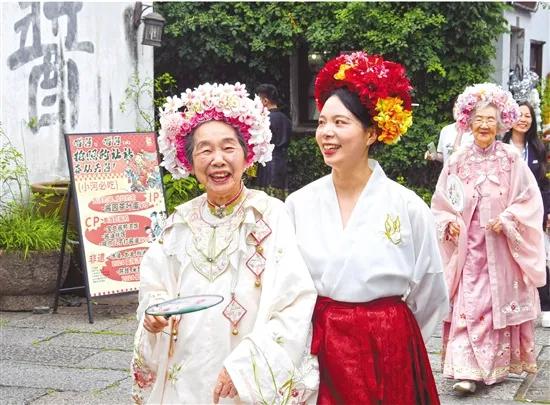 杭州市社会福利中心组织端午节活动,老人和年轻护理员合照。来源:潮新闻