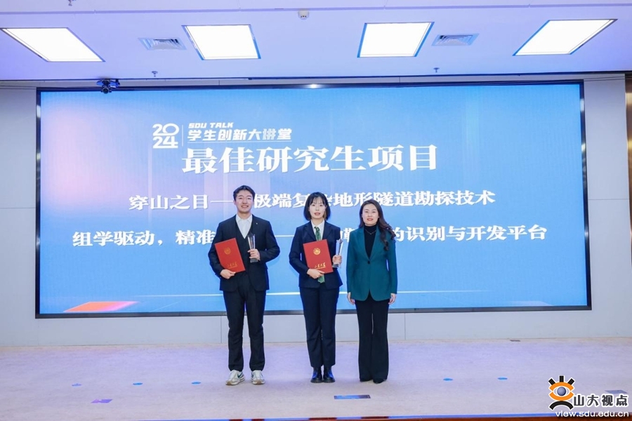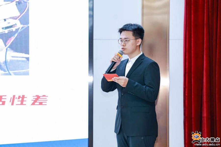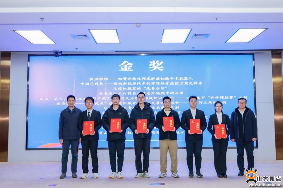 在冠军争夺赛暨成果分享会中,各参赛团队围绕项目背景、研究过程、创新成果、未来规划等进行项目路演。机械工程学院“探‘脑’取物——四臂连续体颅底肿瘤切除手术机器人”项目、机电与信息工程学院“绘乐——用青春画出音乐启蒙新色彩”项目获得本科生组亚军,口腔医学院“新‘锶’考下的外泌体与水凝胶复合材料治疗牙槽骨缺损”项目、生命科学学院“生殖细胞中的‘先奏后斩’”项目、政治学与公共管理学院“‘双减’在左,需求在右:影子教育的运动式治理拉锯战何以破解?——以青岛市‘升学锦标赛’为例”项目获得本科生组季军;公共卫生学院“组学赋能,智创医疗——基于因果推断方法的精准药物靶点识别与开发平台”项目、土建与水利学院“穿山之目——极端复杂地形隧道勘探技术”项目获得“最佳研究生项目”。