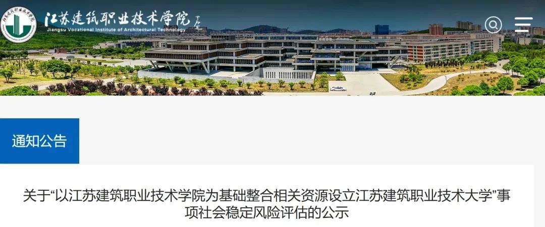 12月12日,江苏建筑职业技术学院官网发布了《关于“以江苏建筑职业技术学院为基础整合相关资源设立江苏建筑职业技术大学”事项社会稳定风险评估的公示》。