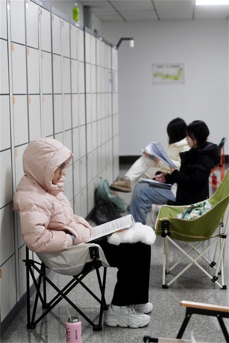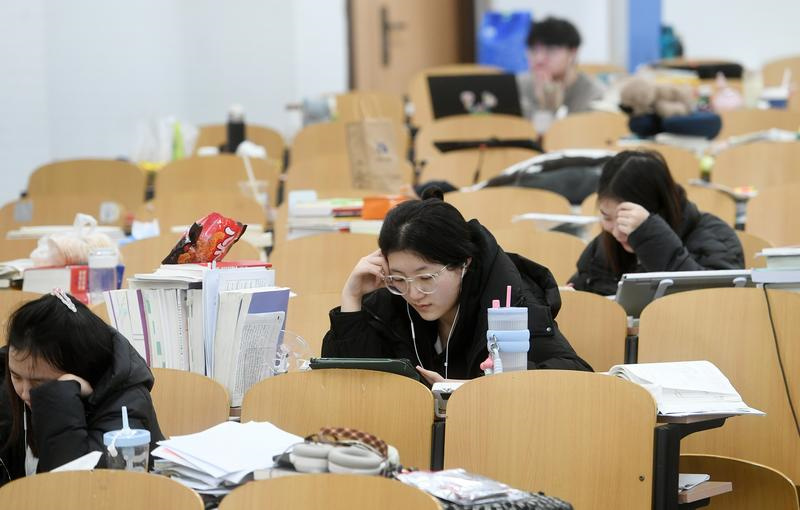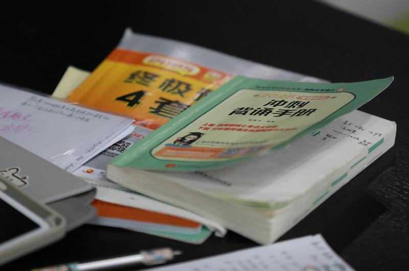 在南京农业大学卫岗校区的两间考研教室,桌子上堆满了复习教材,教室前面散落着一个个便携椅子。教室里,同学们奋笔疾书;教室外,同学们默默背诵知识点。