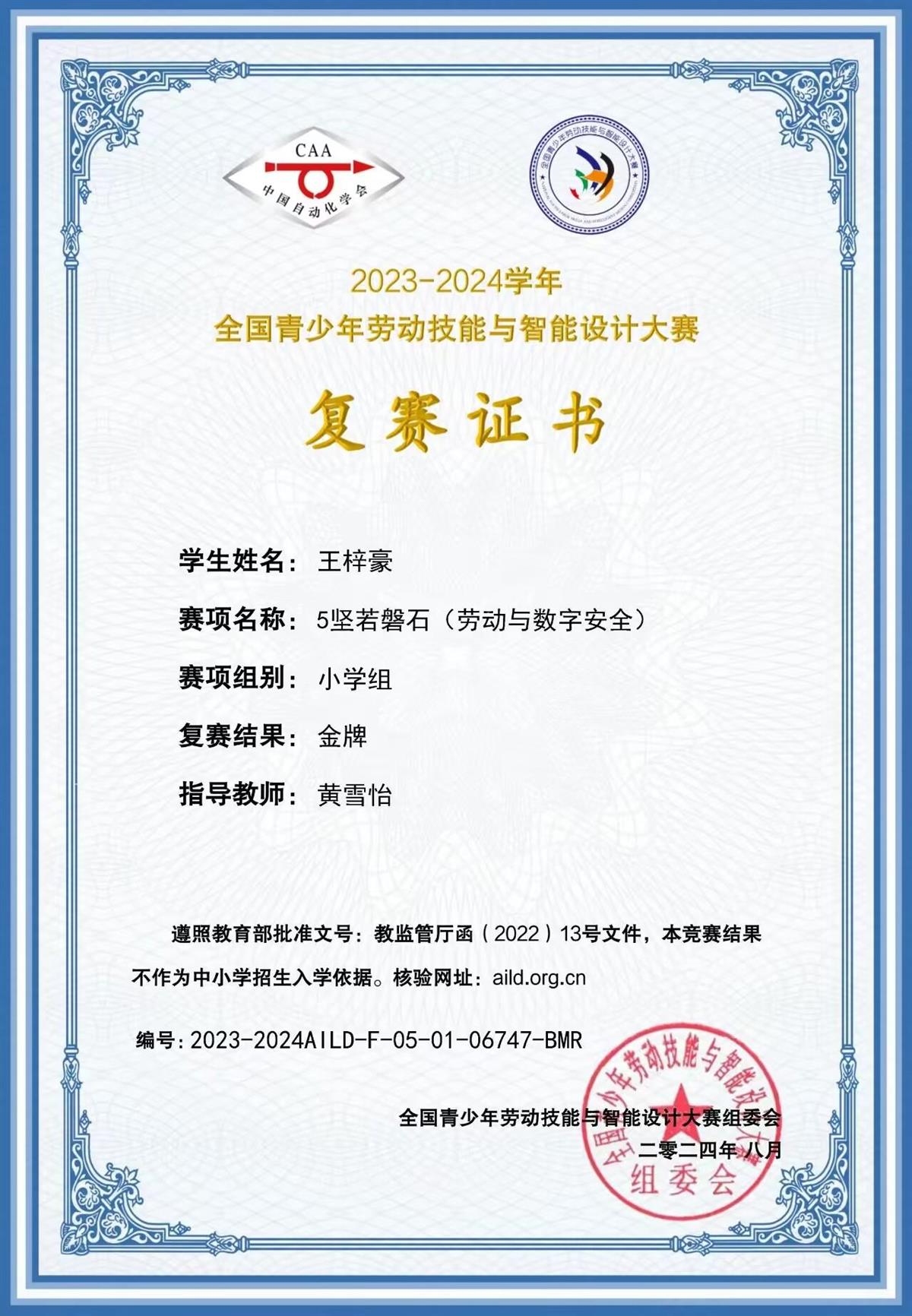 小学部王梓豪在全国青少年劳动技能与智能设计大赛获全国总决赛金牌