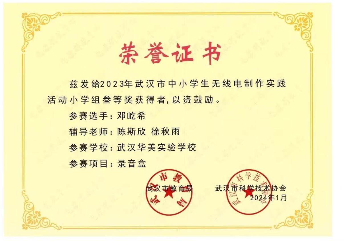 小学部邓屹希获武汉市中小学生无线电制作竞赛活动三等奖