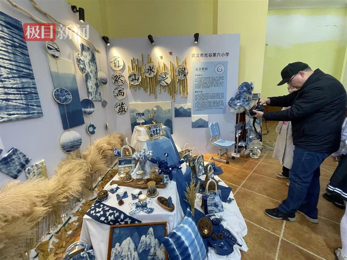 武汉市光谷第十七小学108班学生郭高远和爸爸一起来了。他摸了摸光谷第一小学带来的“金箍棒”,敲了敲光谷实验小学的手作陶瓷编钟,还蹲下来研究光谷第六小学的扎染作品,觉得每一个都有趣。“星期三,班群里有发消息,我们一看,这么近,马上报名。今早,我们散着步就来了。”郭爸爸说。
