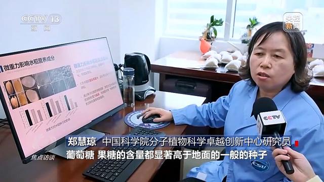 中国科学院分子植物科学卓越创新中心研究员 郑慧琼:天上回来的那些种子,葡萄糖、果糖的含量都显著高于地面的一般的种子,基本上高5到6倍,还有蛋白质含量也比地面要多一些,天上那个种子如果煮成饭,吃起来应该很甜。