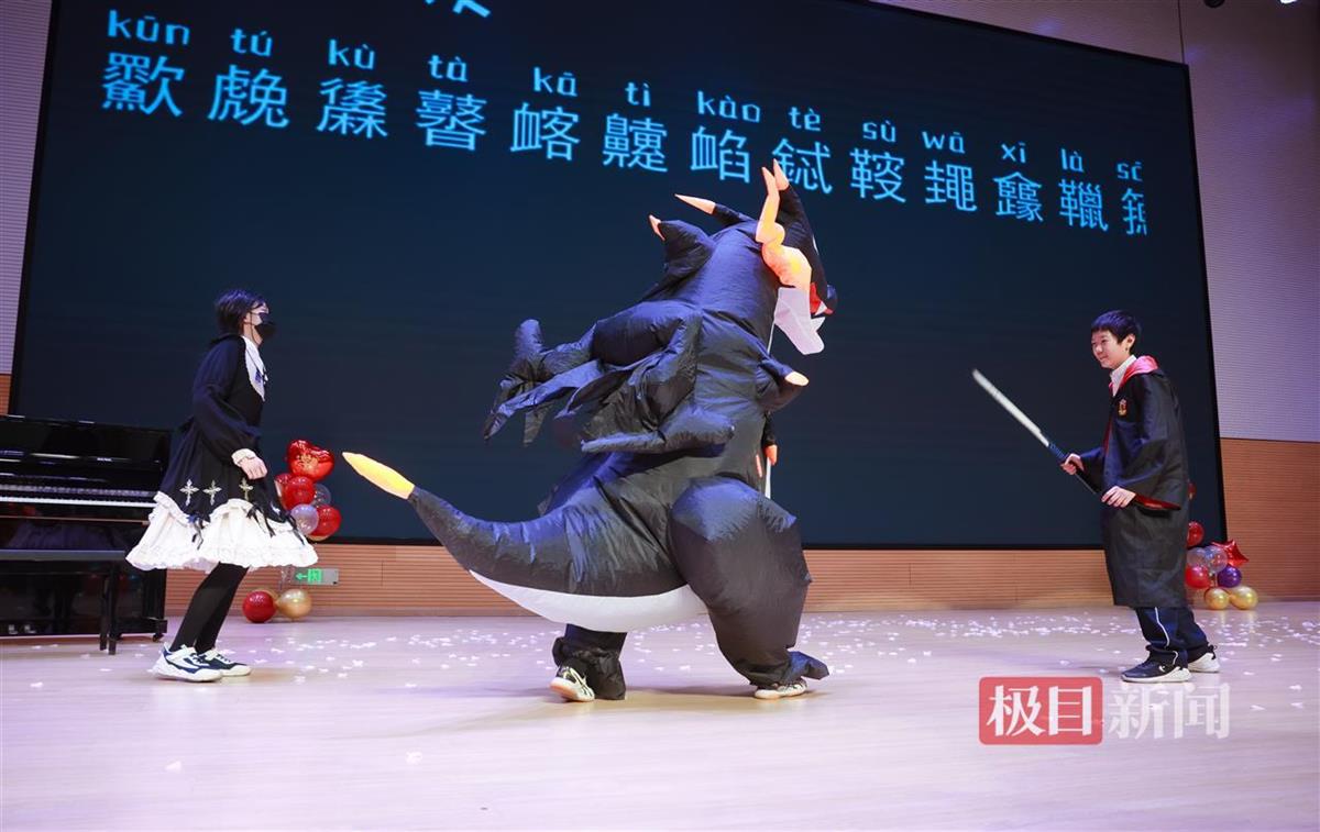 704班学生演了一出《达拉崩吧》话剧,骑士、公主、国王、恐龙、马的服装是他们定的,炫酷搞笑的视频布景也是他们做的。“我从小玩编程,这个还好啦,演恐龙的寇乐芊也有帮我剪视频。”其中身兼导演、舞美设计、骑士扮演者三职的刘致铭说。“我班孩子演《守护之光》小品,就找剧本我帮了点忙,其他都是他们自己安排。上周五全校彩排我第一次看完全剧,发现他们好有创意,好会演。”705班班主任徐怡楠骄傲地说,每次活动都发现许多学生的闪光点,正如“走过冬天”艺术节的slogan(口号)所说,在活动中,青春多了一份厚实,人生多了一份财富。