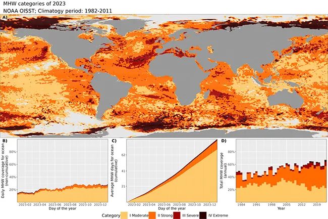 2023年,平均到每天而言,全球近三分之一的海洋受到海洋热浪的侵袭,重要的生态系统和食物系统受到损害。全年来看,超过90%的海洋都经历过热浪事件。