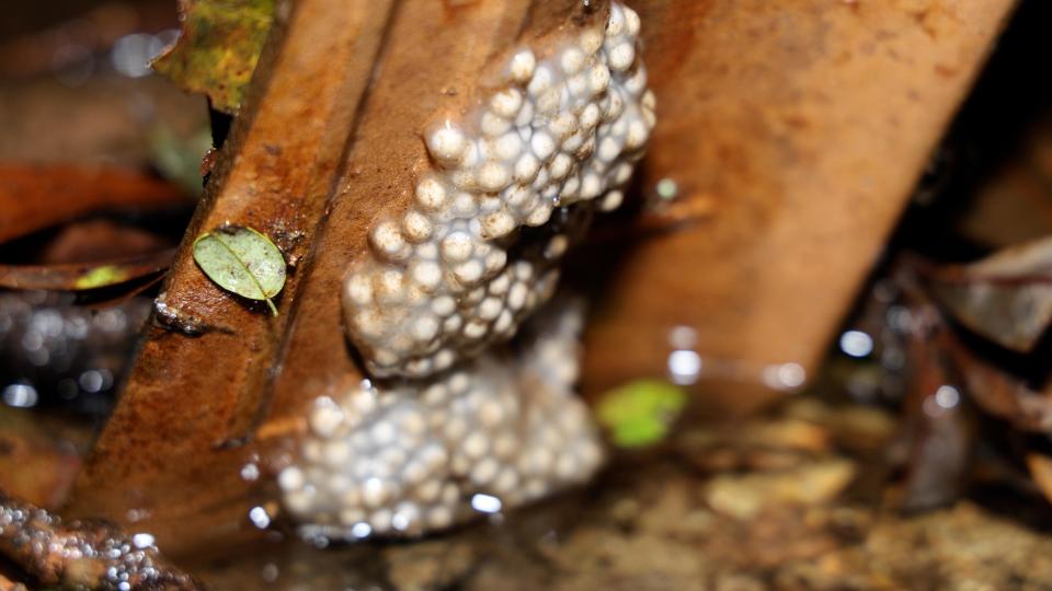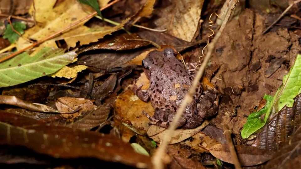 冬日,在云南大围山国家级自然保护区,密棘髭蟾迎来一年一度的繁殖季。夜晚,气温接近零度,密棘髭蟾会挑选水质好、含氧量高且有隐蔽环境的小溪,作为筑巢产卵的地方。