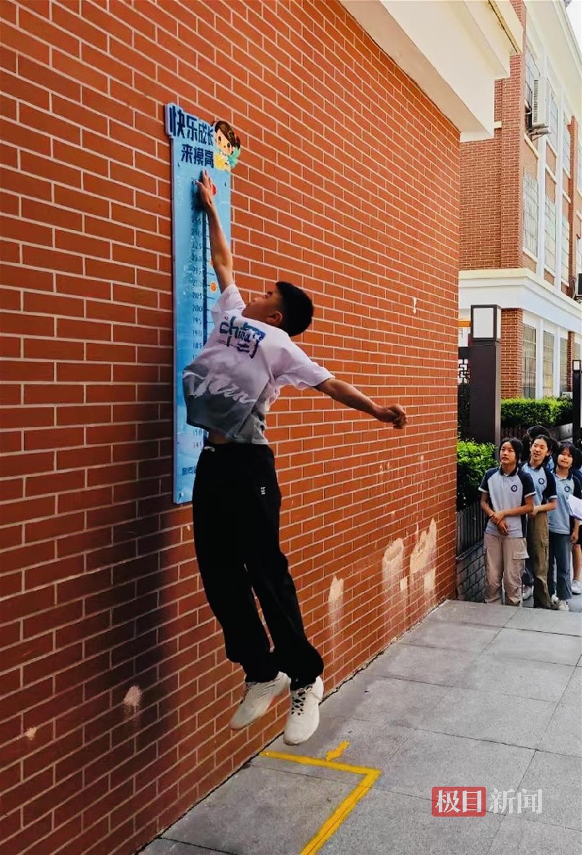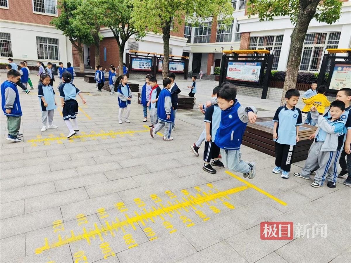 极目新闻记者看到,每栋教学楼的一楼教室都特别增设了摸高墙,吸引学生在碎片化时间里随时参与活动。漫步校园,各类地面游戏错落有致地分布在各个角落,跳格子、萝卜蹲、走迷宫……“下课我就飞一会儿!”单脚跳跃、双脚交替,看到孩子们欢快地穿梭其中,王晓东特别拍照记录,并在朋友圈中配发了这句话。