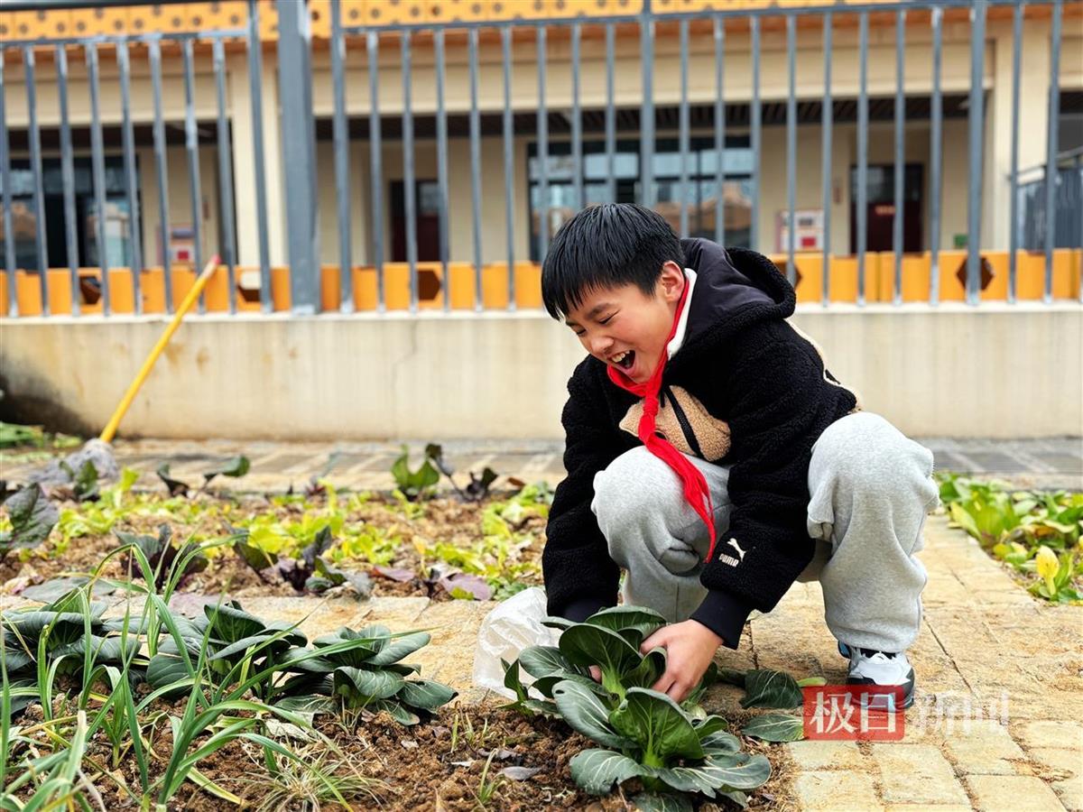 孩子们有很多话说。510班学生王恭怡说,挖地好累呀!“别看都是矮矮的菜,松土要挖1米深,不一会儿人就站不住了,额头、背上都是汗。后来老师奖了我一棵小白菜苗,我舍不得吃,把它种盆里。”她的同学邹境昕说,自己种的菜最好吃,“我以前特别不喜欢吃大白菜,觉得它苦,但从学校菜园挖的就不会,很甜很好吃。但是,收菜虽然开心,却很累,大白菜一个人拔不动,要请同学帮忙,刨土也要小心,不然不完整了影响卖相。”另一位同学占玥萱感叹:“我们养护的好像不是苗,更多是草,草真是坚韧不拔啊!拔一棵草很容易,拔一堆草可真难!因为付出很多,看到菜一天天长大、结果,特别有成就感。”