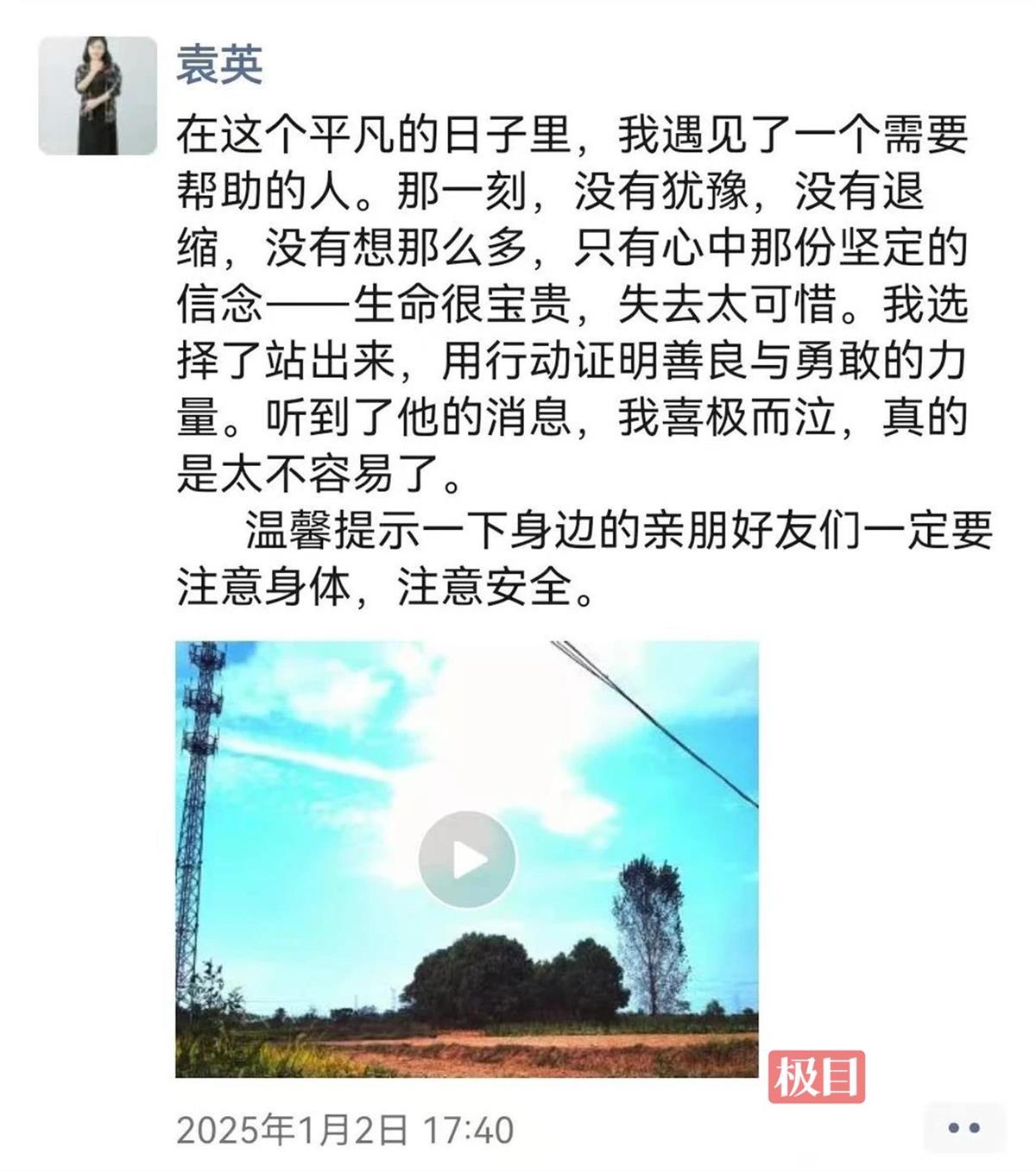 “我们要好好感谢你,你救了我们一家子!”面对余俊强家人的感谢,袁英只是互相留了联系方式后离开。当天,袁英发了条朋友圈“在这个平凡的日子里,我遇见了一个需要帮助的人。那一刻,没有犹豫,没有退缩,没有想那么多,只有心中那份坚定的信念——生命很宝贵,失去太可惜。我选择了站出来,用行动证明善良与勇敢的力量。听到了他的消息,我喜极而泣,真的是太不容易了。”