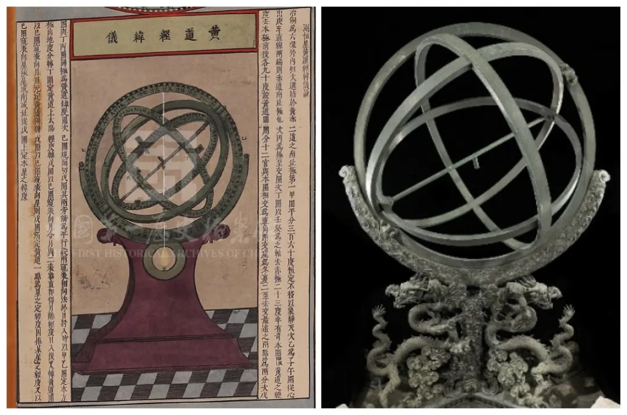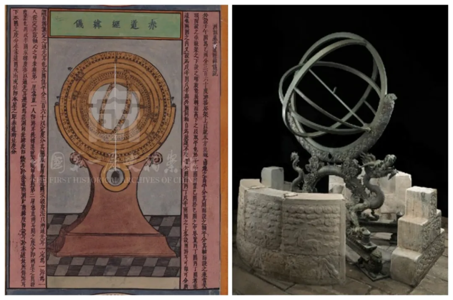 △左为《赤道南北两总星图》中的赤道经纬仪图,右为北京古观象台的赤道经纬仪。