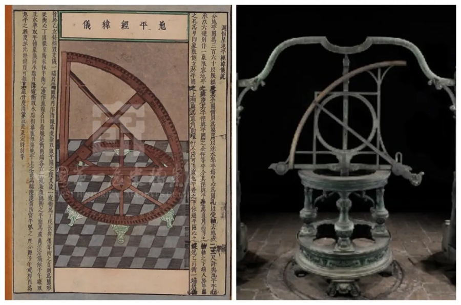 △左为《赤道南北两总星图》中的地平经纬仪图,右为北京古观象台的地平经纬仪。