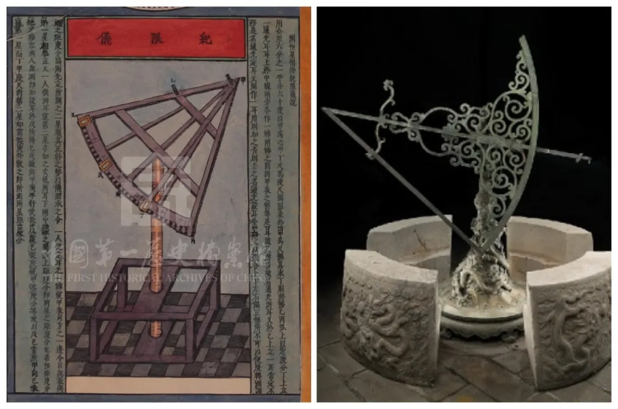 △左为《赤道南北两总星图》中的纪限仪图,右为北京古观象台的纪限仪。