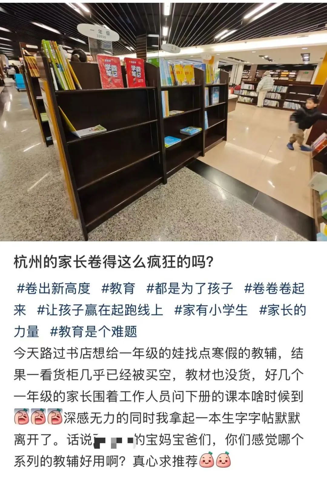 这位家长表示,路过书店想给一年级的娃找点寒假教辅,结果一看货柜几乎已经被买空,教材也没货。“好几个一年级的家长围着工作人员问下册的课本啥时候到。深感无力的同时,我拿起一本生字字帖默默离开了。”