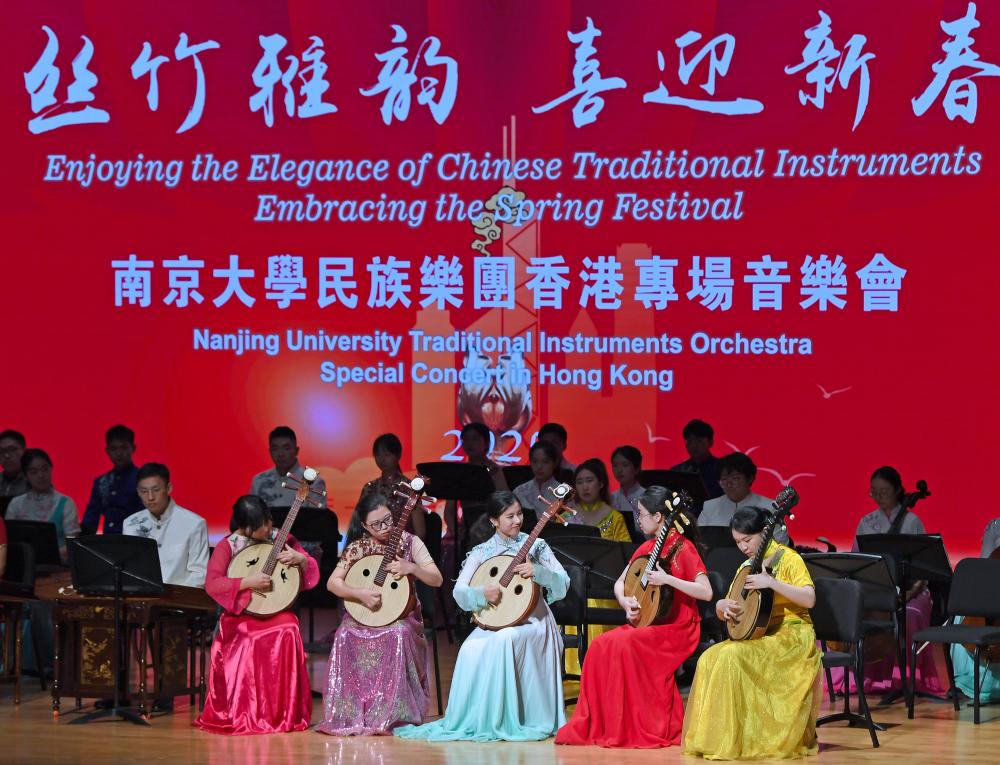 当日,南京大学民族乐团在香港理工大学举办“丝竹雅韵 喜迎新春”音乐会。南京大学香港校友代表、香港理工大学师生、香港中学生代表等约1000人出席音乐会。