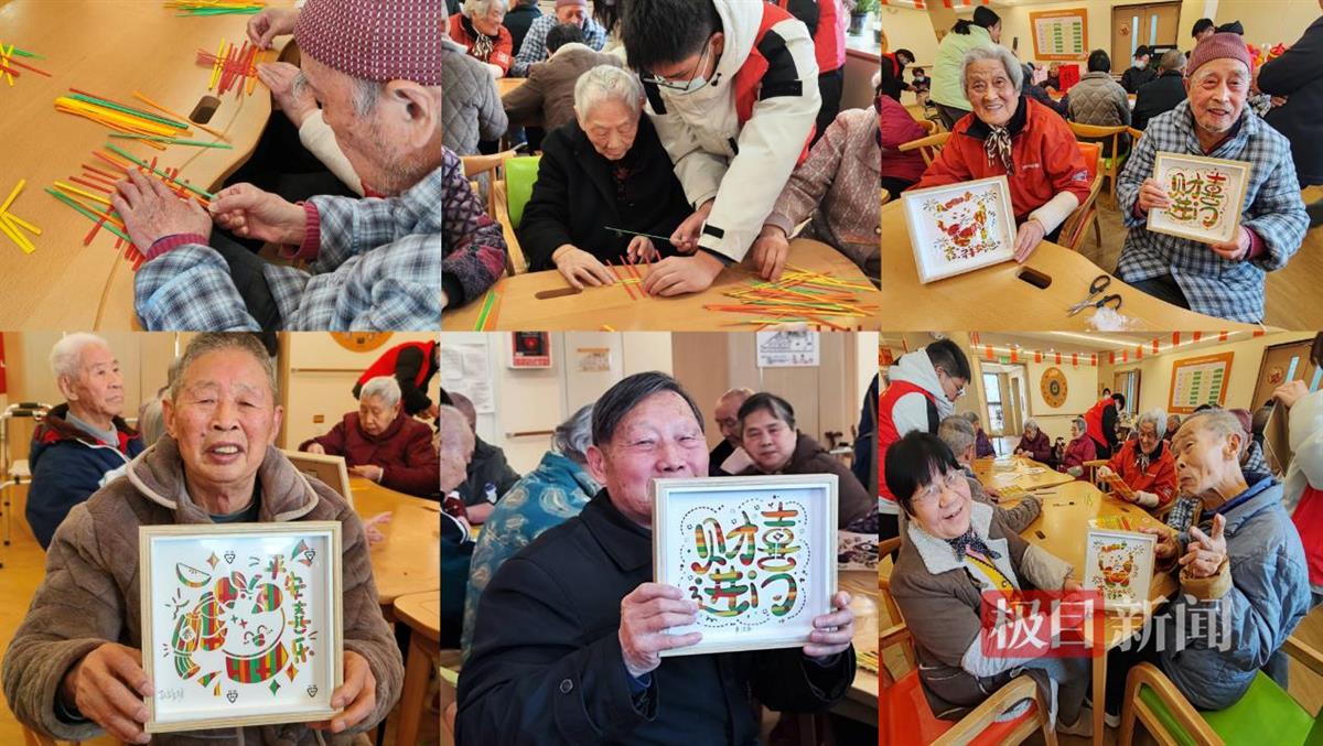 除了贴对联、贴福字,志愿者们还带来竹编相框,由老人们编织出“祝福”等字样。志愿者们耐心询问了老人们的生活起居和养老条件,赵奶奶笑着告诉志愿者,“现在生活挺好的,每天有人照顾,也有小朋友和大学生经常来看我们,我很满足。”