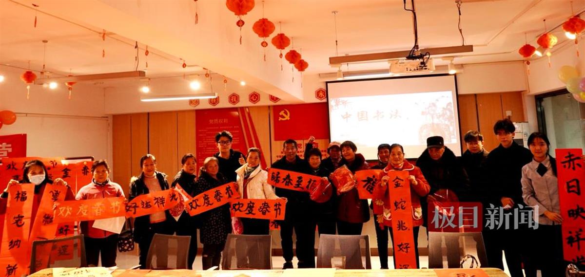 看着墙上的对联、福字和桌面上的竹编,张奶奶开心地说:“以前过年都是自己随便贴个对联,今年有这么多年轻人陪我们一起编竹编、写对联、写福字,感觉更有过年的氛围了。”