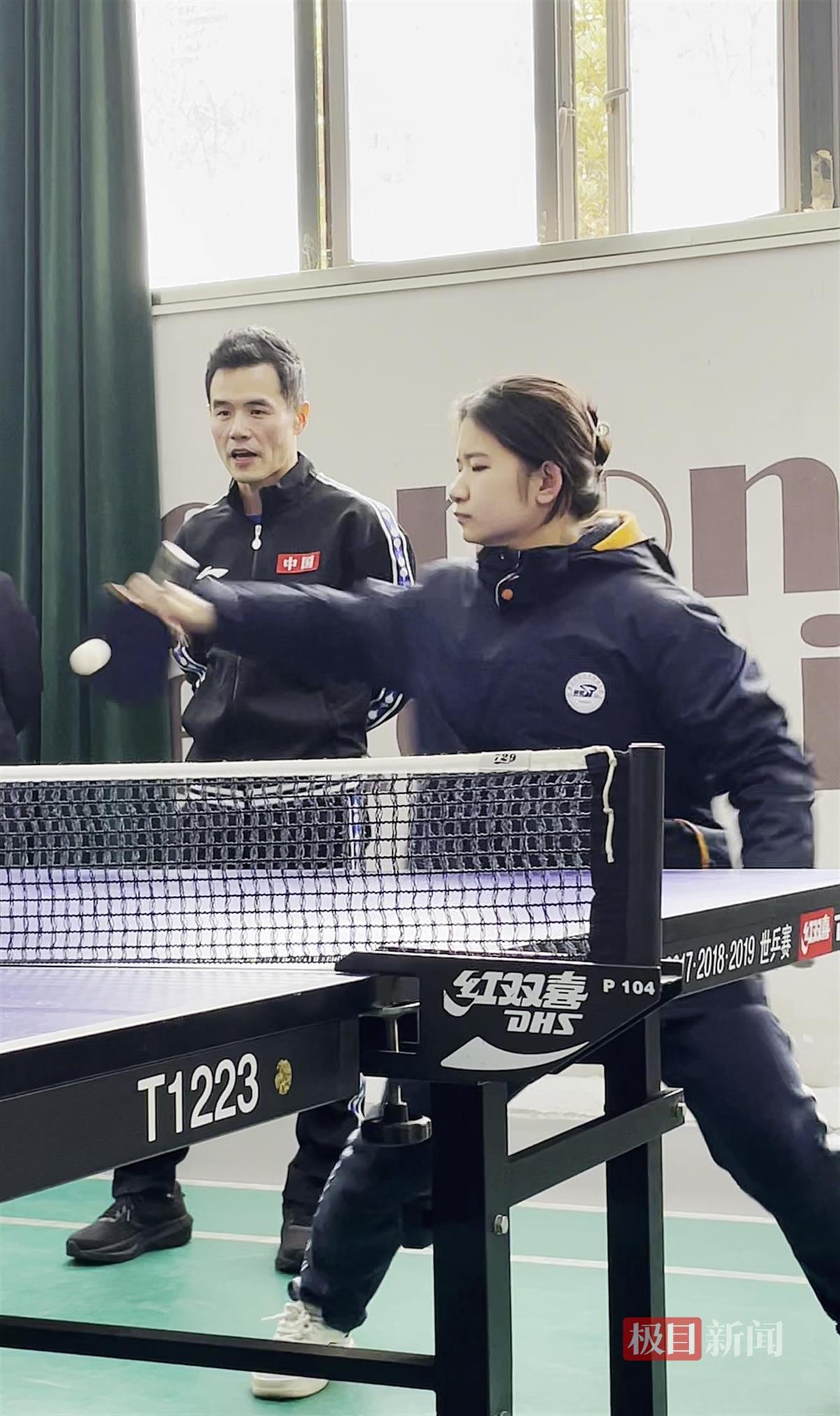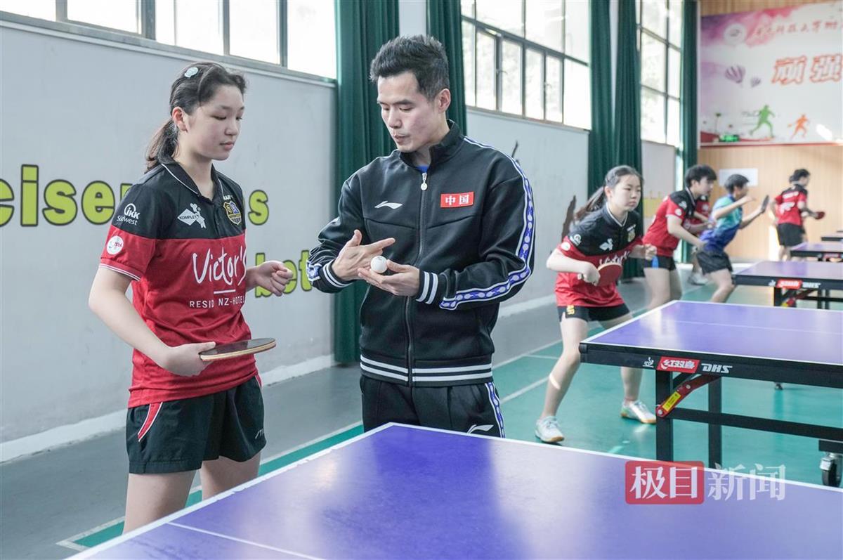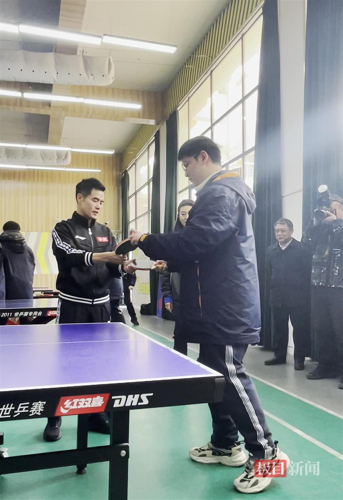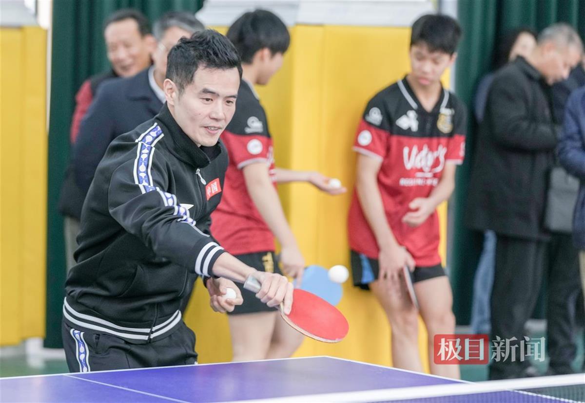 正因此,当天刘国正的指导课不仅给华科附中乒乓球队的队员们上,也给该校高三(11)班的学生们上。其间,他尽显“鼓励型教练”本色。“我平时是打反手的,刘老师现场教我正手基础,还把他的‘神拍’给我用。”第一个上场接受指导的高三(11)班学生彭小宸说。他的同班同学伍梓菁说:“我是初学者,刘老师耐心教我‘上台’,还夸我敢冲,有求胜欲。”