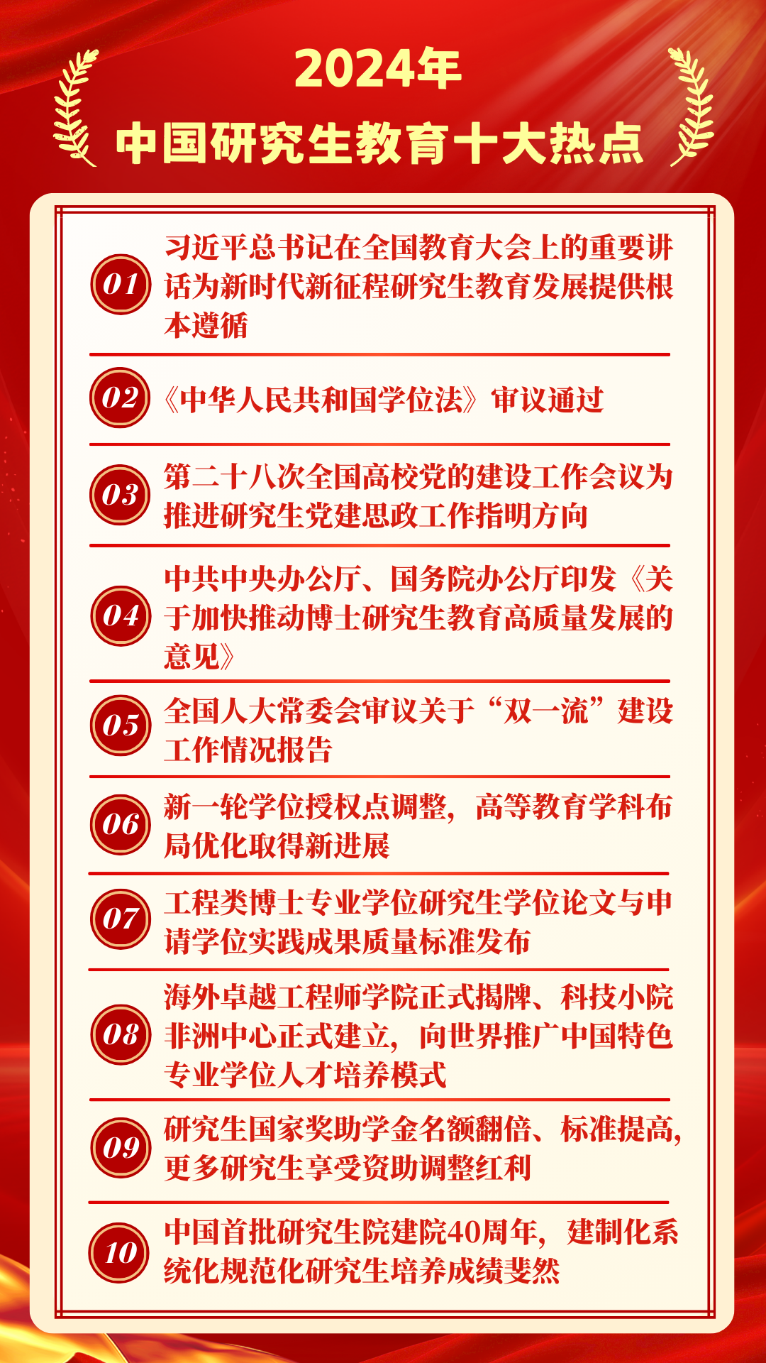 2024年,是中国学位与研究生教育发展史上具有重要里程碑意义的一年,在教育部学位管理与研究生教育司指导下,教育部学位与研究生教育发展中心《中国研究生》杂志回顾总结全年研究生教育大事要事和热点动态,联合人民网、新华网、中国教育报和有关研究生教育媒体等共同发布2024年中国研究生教育十大热点。