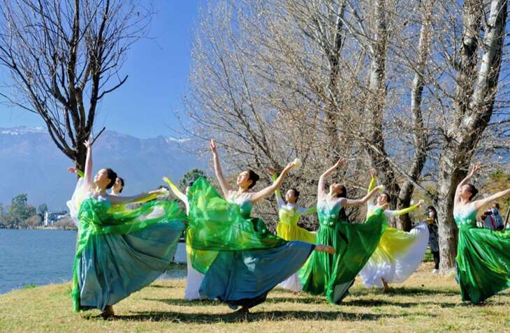 音乐声响起,《海菜花开》剧中的当地村民金花来到古生村现场,向游客们介绍洱海十年坚守绘就碧水蓝天新画卷的动人场景。波光粼粼的洱海湖畔,学校舞蹈团的同学翩然起舞,以舞蹈《海菜花开》与美景相呼应。