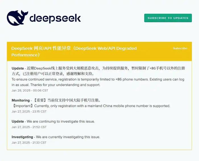 1月28日,DeepSeek官网的服务状态页面显示:近期DeepSeek线上服务受到大规模恶意攻击,为持续提供服务,暂时限制了+86手机号以外的注册方式,已注册用户可以正常登录,感谢理解和支持。