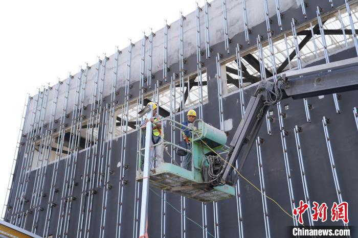 2月10日,海南比勒费尔德应用科学大学项目施工现场,工人正在进行外立面装饰作业。陈英清摄
