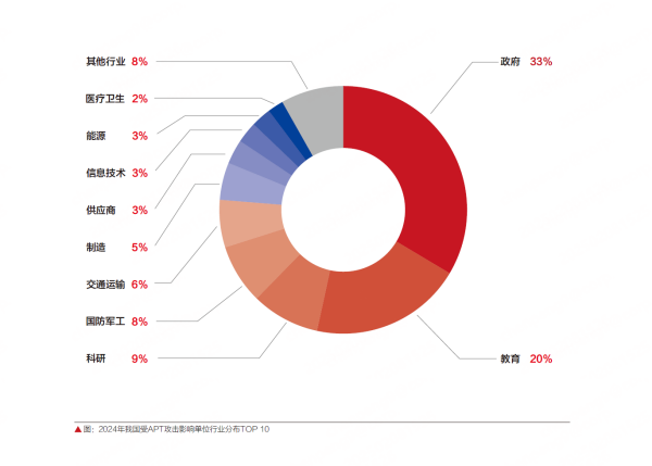 据360安全大模型监测,我国受APT攻击影响单位主要涉及14个重点行业领域,政府机构、教育、科研、国防军工和交通运输是遭受APT攻击活动最为集中的5个行业。这主要是由于APT组织针对特定行业的攻击,通常实施窃取敏感数据,甚至战略性破坏,用以服务于攻击者背后势力的政治、军事或经济等目的。